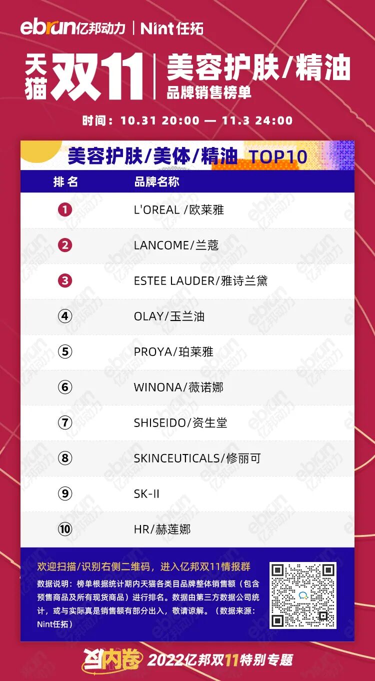 根据数字零售数据服务商Nint任拓提供的销售额数据,在10月31日20:00-11月3日24:00内,来自美容护肤、手机、大家电和运动鞋品类的9个品牌销售额已破10亿大关,分别是,欧莱雅、兰蔻、雅诗兰黛、玉兰油、珀莱雅、苹果、海尔、美的和耐克。