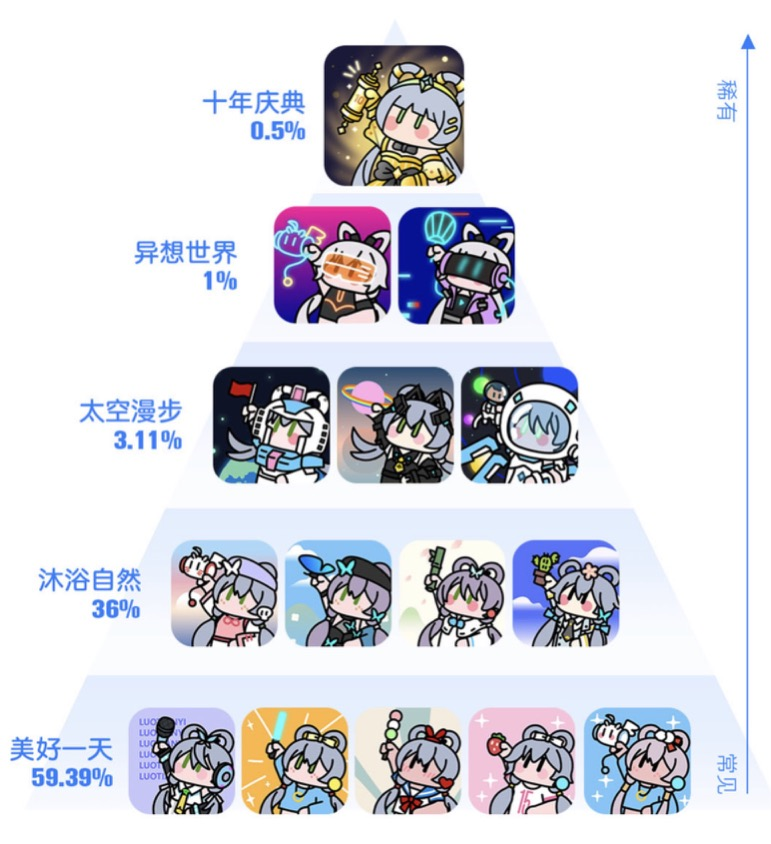 每套藏品都具有稀有值,诚如“干杯!洛天依”联名款原创数字藏品头像打造了“美好一天”“沐浴自然”“太空漫步”“异想世界”“十年庆典”五个主题,其稀有值各不相同,分别是59.39%、36%、3.11%、1%、0.5%。“粗略估计,如果出现稀有藏品,投资翻个倍也是可能的。”