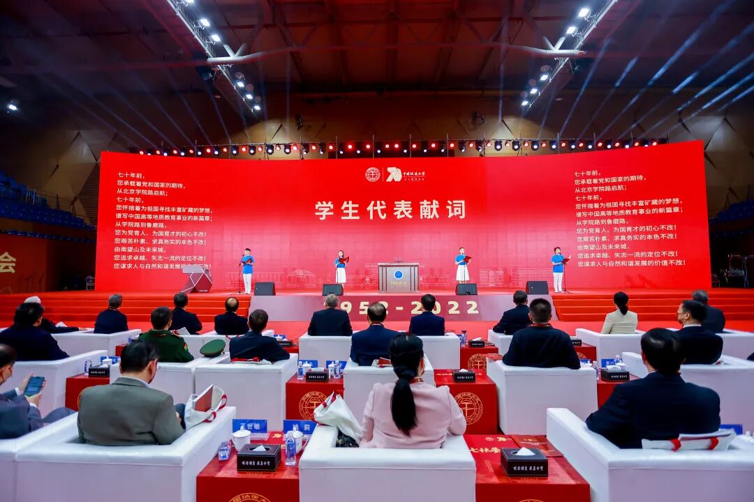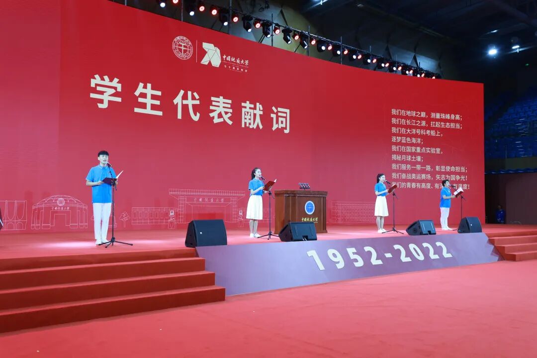 “芳华七秩,地大正青春!奋斗当下,我们正青春!新一轮找矿突破战略行动,报国有我!国家高水平科技自立自强,创新有我!促进人与自然和谐共生,实干有我!构建人类命运共同体,担当有我!我们有志气、有骨气、有底气!”学生代表王逸飞、王雪蓉、金薇、王可一为学校70华诞献词。四位学子精神抖擞,吟诵出地大青年的爱校之情,报国之志,献词掷地有声,振奋人心,焕发新时代的青春正能量,“红心向党,学以报国;请党放心,强国有我”!