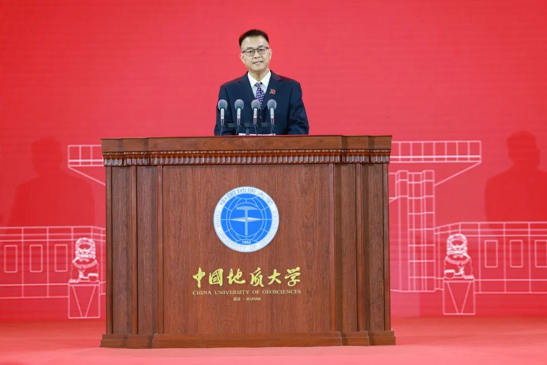 中国地质大学(武汉)校长王焰新院士讲话。他代表学校向全体地大人致以节日的问候和美好的祝福,向莅临大会的各位领导、来宾表示热烈的欢迎,向关心和支持学校发展的社会各界人士、国际友人表示衷心的感谢,向在办学历程中无私奉献的离退休老领导、老同志表示崇高的敬意。