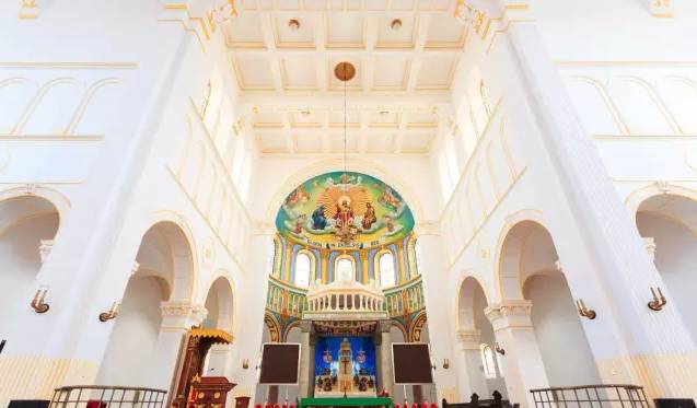 粉红色的教堂,浅米色的外墙,光是看外表就觉得这个教堂充满少女心!