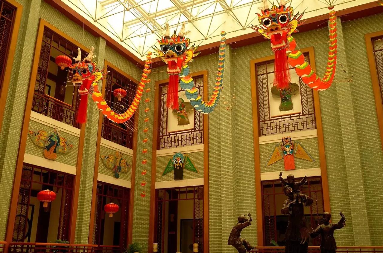 建筑造型选取了潍坊龙头蜈蚣风筝的特点,屋脊是一条完整的组合陶瓷巨龙,屋顶用孔雀兰琉璃瓦铺成,似蛟龙遨游长空伏而又起,设计风格在国内独树一帜。