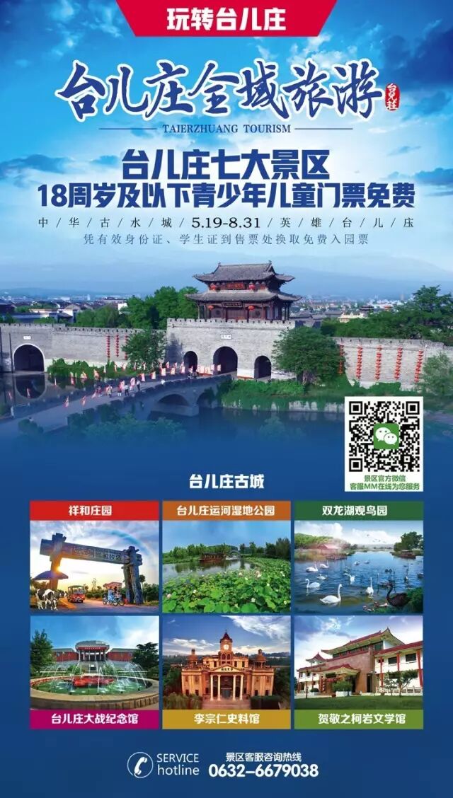福利!台儿庄古城领衔七大景区对外宣布:即日至8月31日期间,全国18周岁(含18周岁)以下青少年儿童将实行免费政策,凭有效证件即可免费畅游台儿庄古城、双龙湖观鸟园、台儿庄运河湿地公园、古城祥和庄园、台儿庄大战纪念馆、李宗仁史料馆、贺敬之柯岩文学馆七大景区。