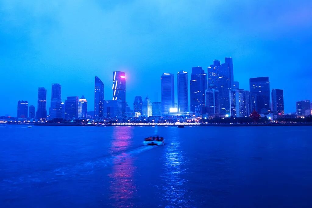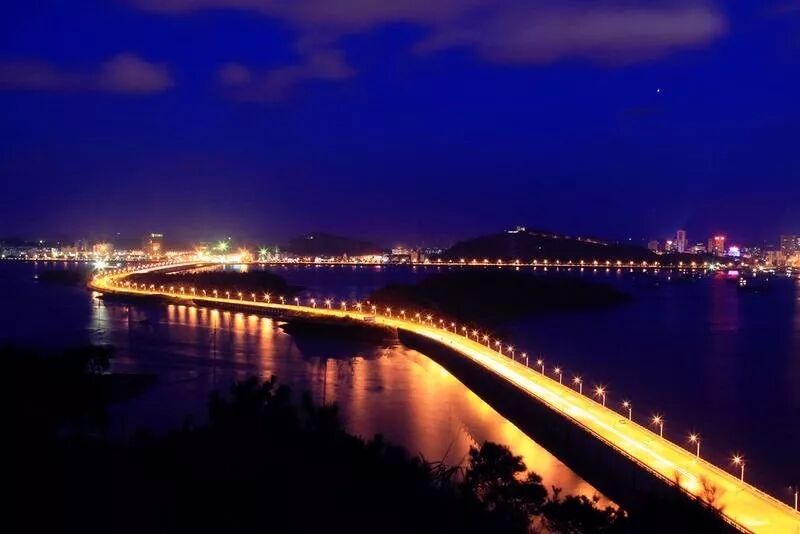 夜晚的环海路边,橙黄色的信号灯和对岸的摩天大厦交相辉映,