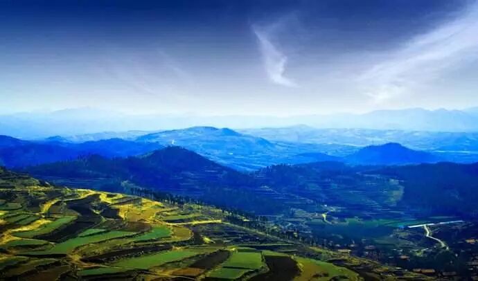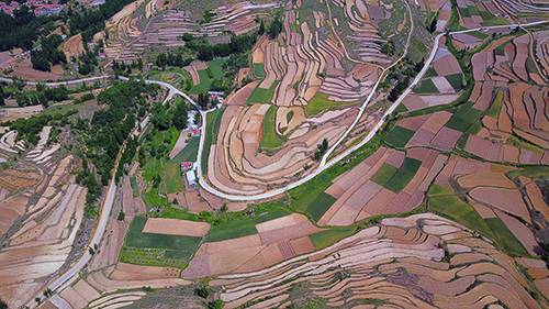层层叠叠的梯田好似一条条彩带蜿蜒向远方