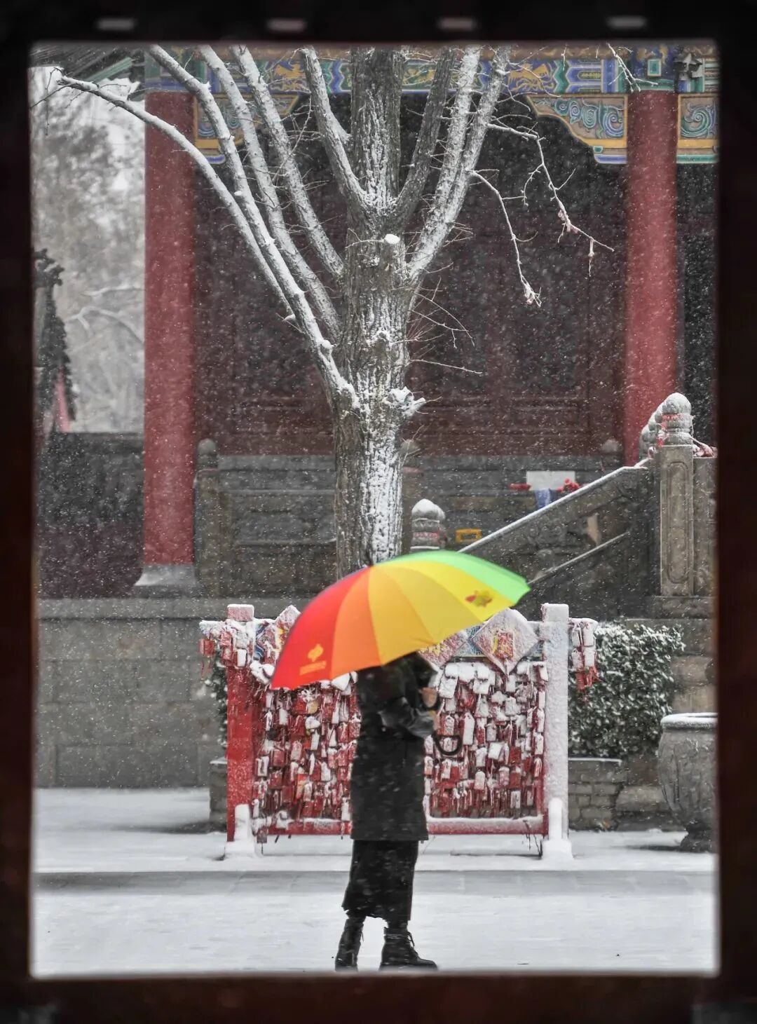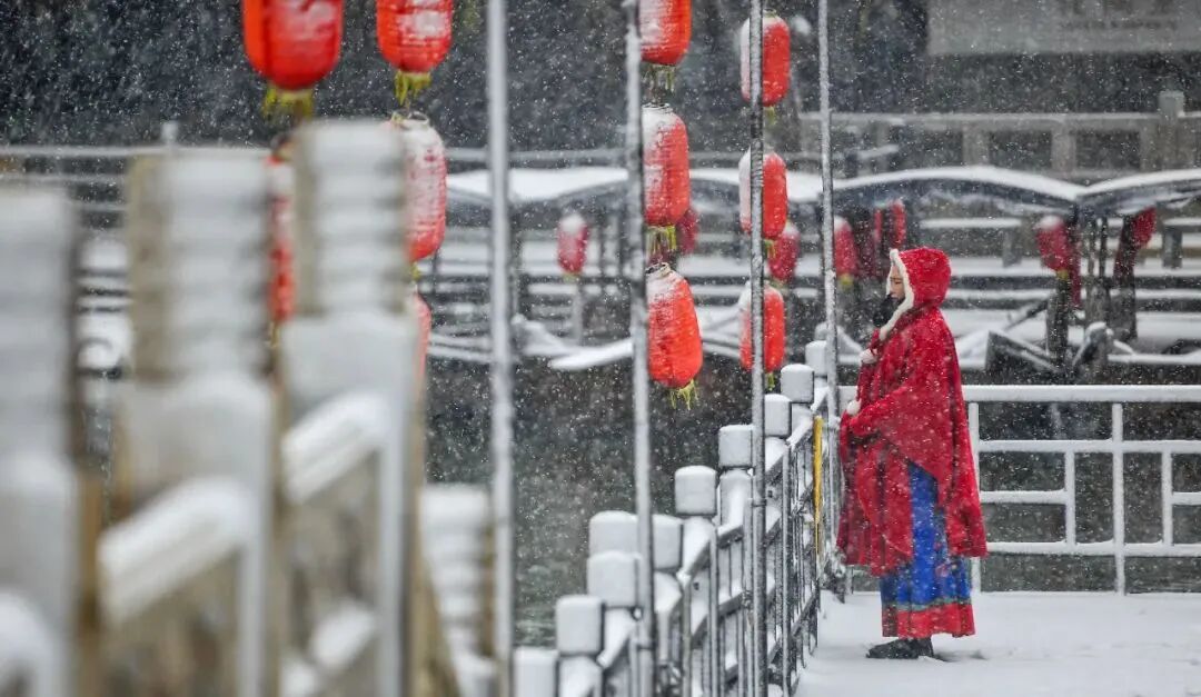 风雪中飘摇的红灯笼、如意结,家家户户楹柱上贴的大红对联,眼花缭乱的趣味小商贩,热气腾腾的风味美食,陡然增添了古城隆冬时节的盎然春意。