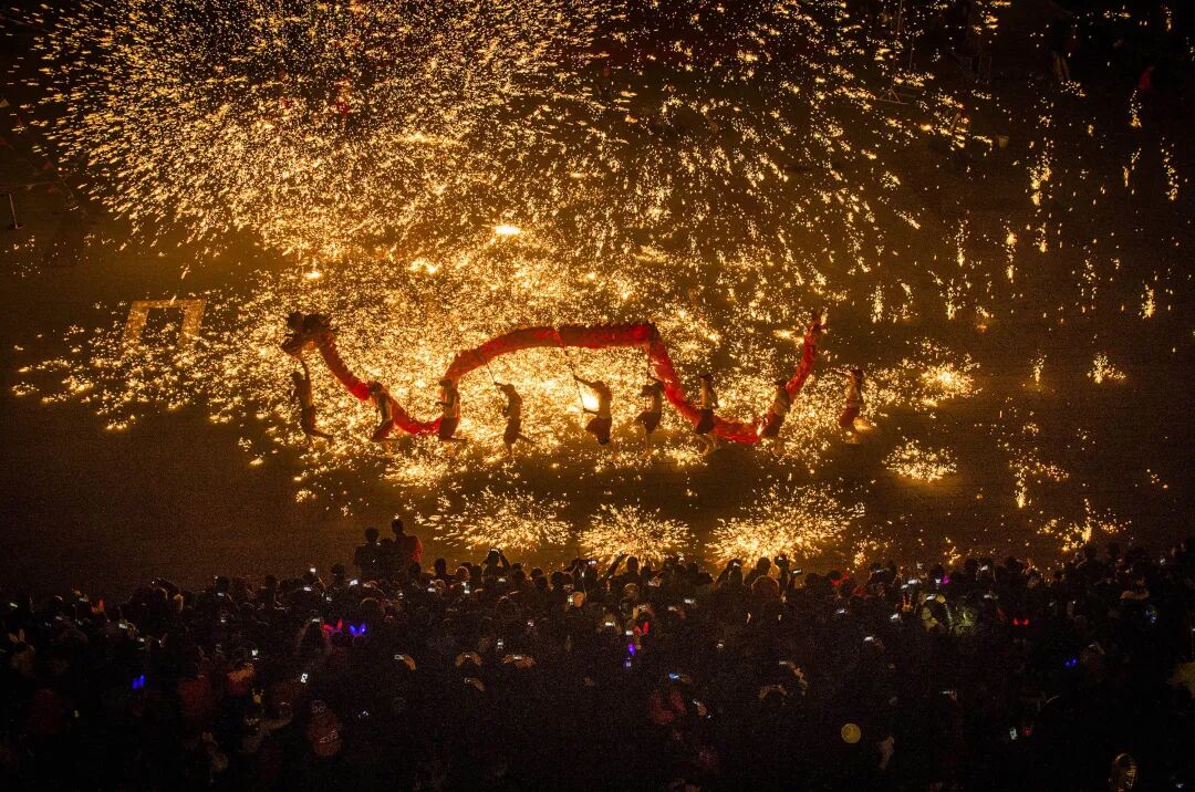 铁树银花落,万点星辰开。飞舞的铁花一粒粒在夜空绽放,漫天的花火像是璀璨的星河,气势磅礴震撼人。
