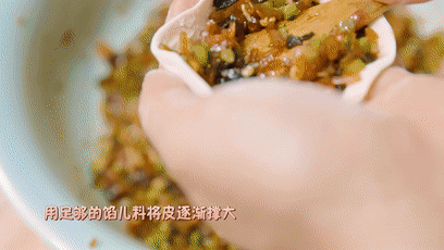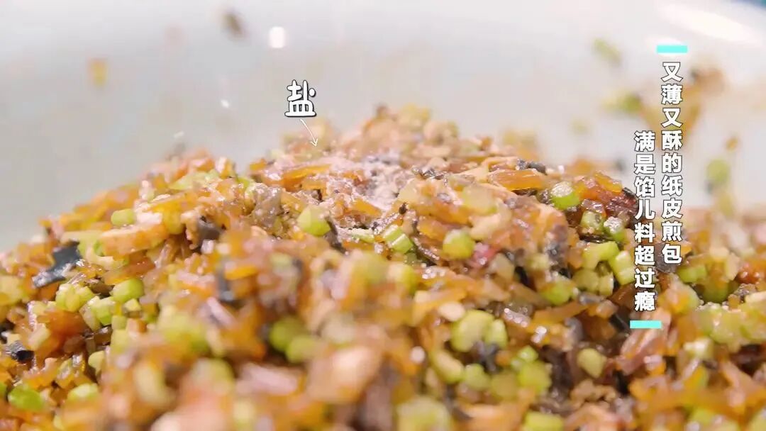 用轻薄的面皮包裹上五花肉、粉条、芹菜、木耳在混合制成馅料,放入煎锅之中,再倒上面水,煎它个十分钟。