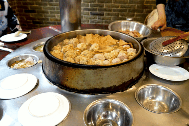 一群人围着圆桌就坐,中间一口大锅四溢着热气,锅里头正在咕嘟咕嘟翻滚的汤水中满是炸豆腐、肥肠、丸子,煮锅师傅眼疾手快的捞出煮到恰到好处的美味,盛入你的碗中。