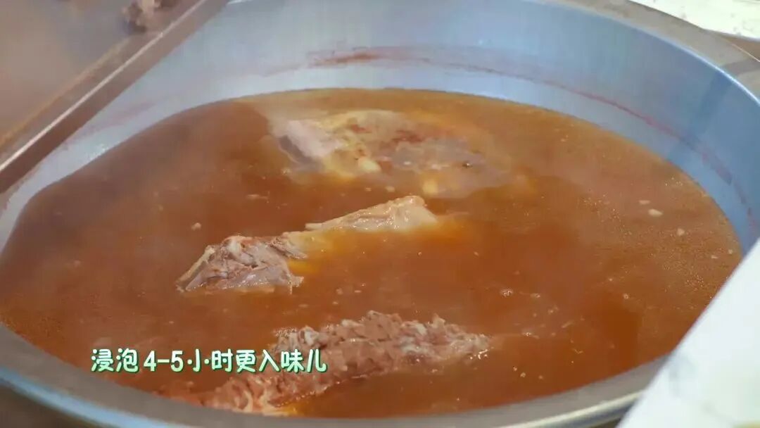 肋排是一只羊身上最为鲜嫩的部分,取鲁中山区散养山羊的肋排刷红曲米水腌制,这便能最大限度的激发羊肉的鲜味,再放入老汤中翻煮浸泡,更是“鲜上加鲜”。