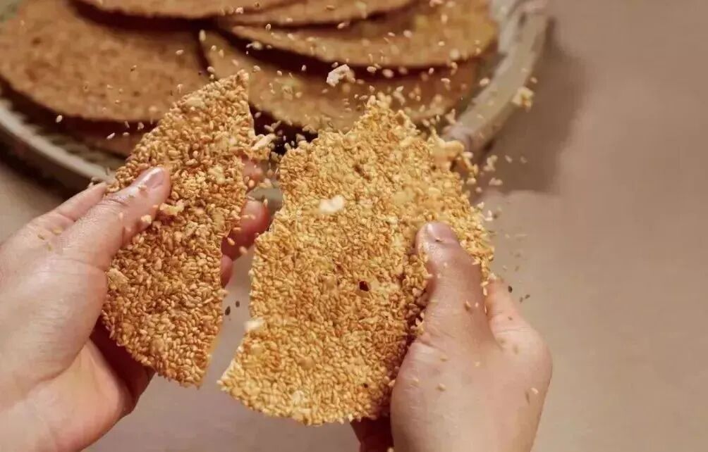 只用轻咬一口,伴随着“咔嚓”一声,一大块烧饼便落入口中。细细咀嚼,芝麻的香气包裹着回甘的面香,香满口腹,让人停不下来。