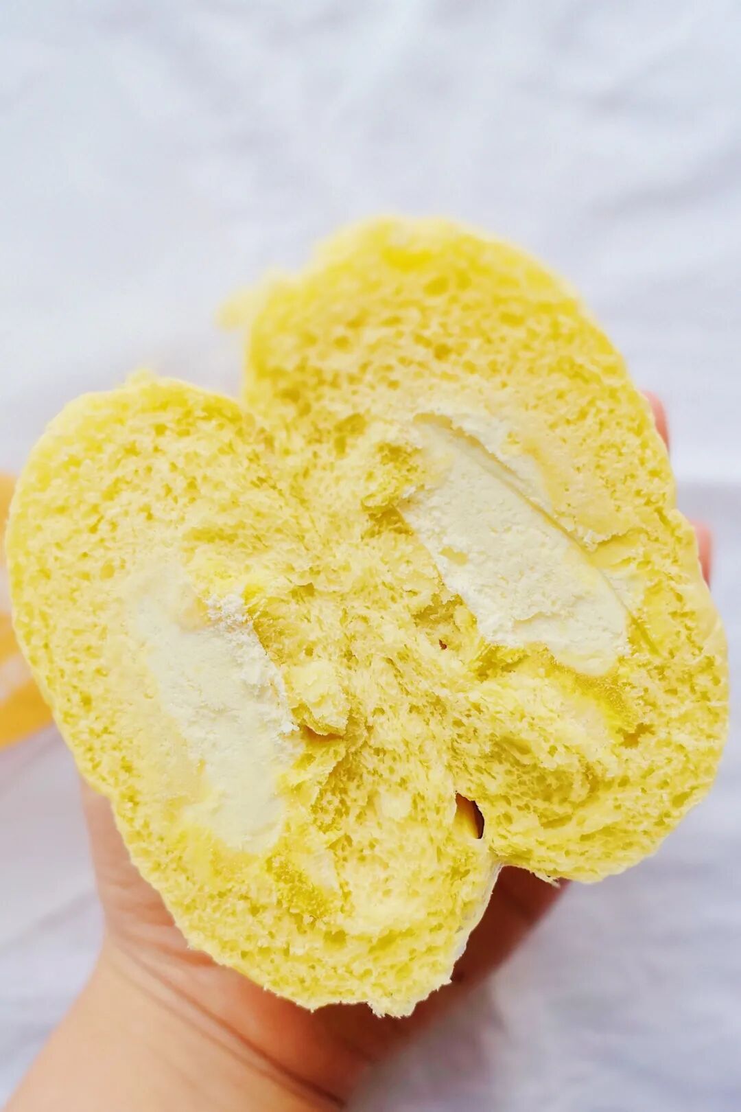 全家也出了冰面包了,有酸奶味、榴芒味、和草莓味。个人更喜欢榴芒味。淡淡的榴莲味和芒果搭配起来很清凉,夏天吃一个心情也跟着变清爽,8元/个。