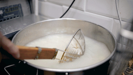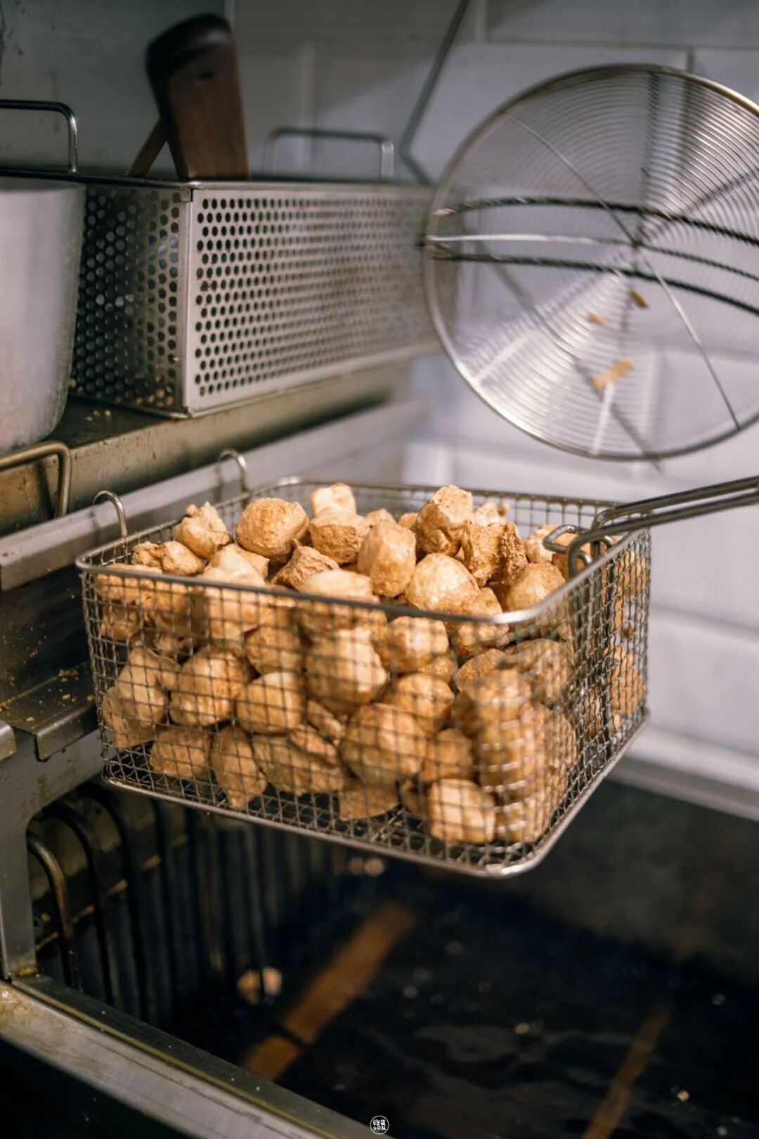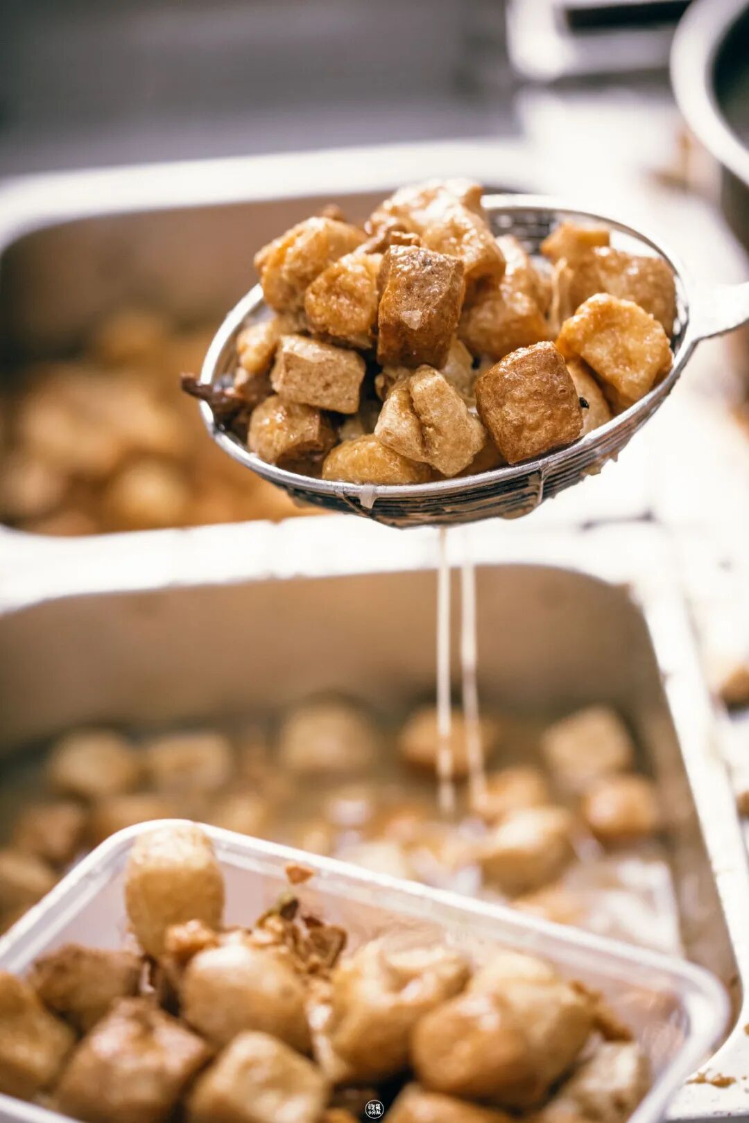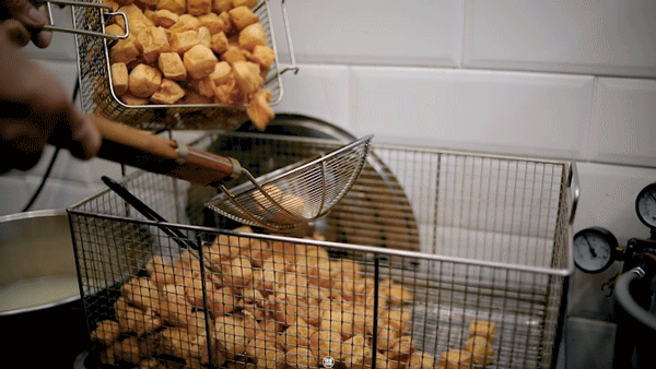 王老头要用3个大锅炸豆腐,问老头为什么,他都会调侃的说,“好玩呗,三个锅一起炸,不寂寞。”但我觉得他在吹水,我猜是每个锅的油温都不一样,经过3次炸制能让臭豆腐更脆香。新店也沿用了这个经典炸豆腐方式,一出锅就能闻到独特的“香气”。