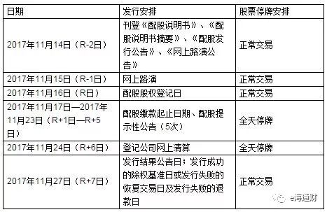 配股缴款时间:2017 年 11 月 17 日(R+ 1 日)起至 2017 年 11月 23 日(R+ 5 日)。