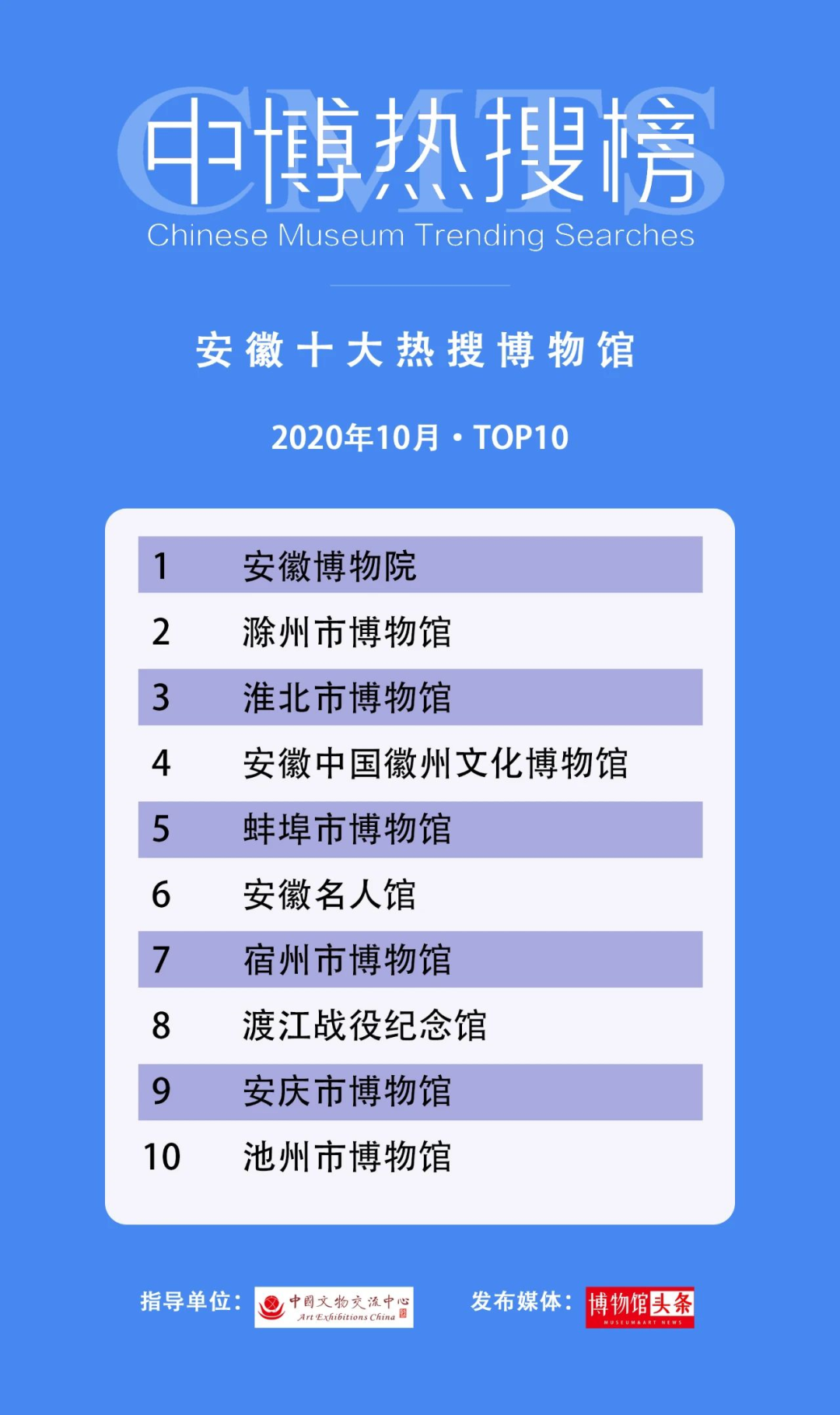 2020年11月6日,由中国文物交流中心指导,博物馆头条发布的第六期“中博热搜榜”正式发榜,本期榜单发布4个全国热搜榜单和31个区域榜单。全国榜单包括“⼗⼤热搜博物馆”“⼗⼤热搜展览(推介)”“⼗⼤热搜⾰命类博物馆(纪念馆)”“⼗⼤热搜⾃然类博物馆”。区域榜单为各省市10月份十大热搜博物馆。