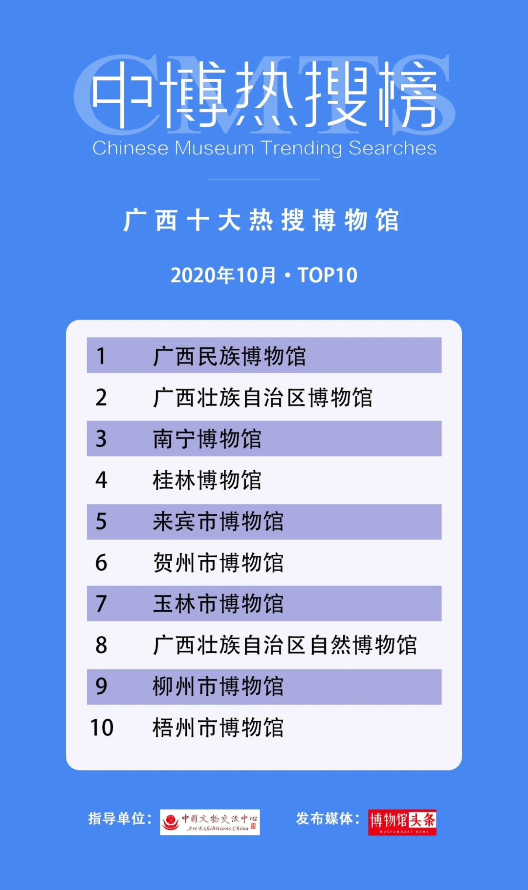 2020年11月6日,由中国文物交流中心指导,博物馆头条发布的第六期“中博热搜榜”正式发榜,本期榜单发布4个全国热搜榜单和31个区域榜单。全国榜单包括“⼗⼤热搜博物馆”“⼗⼤热搜展览(推介)”“⼗⼤热搜⾰命类博物馆(纪念馆)”“⼗⼤热搜⾃然类博物馆”。区域榜单为各省市10月份十大热搜博物馆。