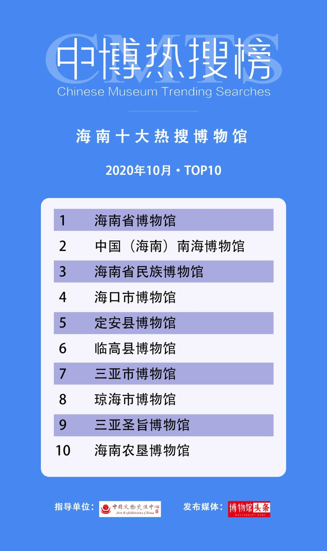2020年11月6日,由中国文物交流中心指导,博物馆头条发布的第六期“中博热搜榜”正式发榜,本期榜单发布4个全国热搜榜单和31个区域榜单。全国榜单包括“⼗⼤热搜博物馆”“⼗⼤热搜展览(推介)”“⼗⼤热搜⾰命类博物馆(纪念馆)”“⼗⼤热搜⾃然类博物馆”。区域榜单为各省市10月份十大热搜博物馆。