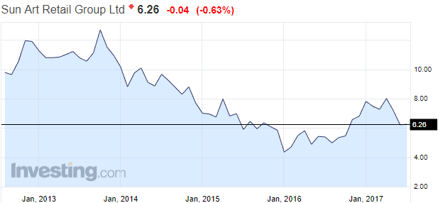 但这样的盈利显然不是长久之计。相较过去,高鑫零售的股价已有不少回落,目前公司6块多港元的股价仅为其2013年时的一半。