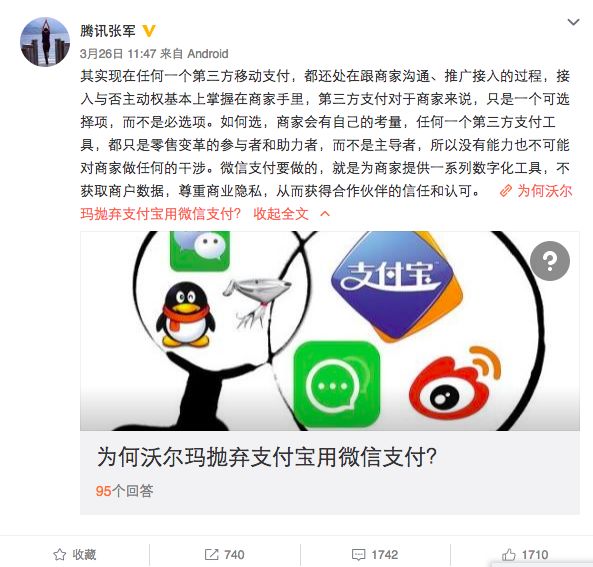 媒体注意到,认证为腾讯公关总监的@腾讯张军发微博称,第三方支付对于商家来说,只是一个可选择项。如何选,商家会有自己的考量。任何一个第三方支付工具,没有能力也不可能对商家做任何的干涉。