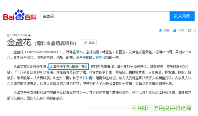 金盏花本身富含多种维生素,特别是维生素A和维生素C,肌肤迅速吸收后,能起到镇静舒缓的作用,而且金盏花有消炎,舒缓,抗菌功效。
