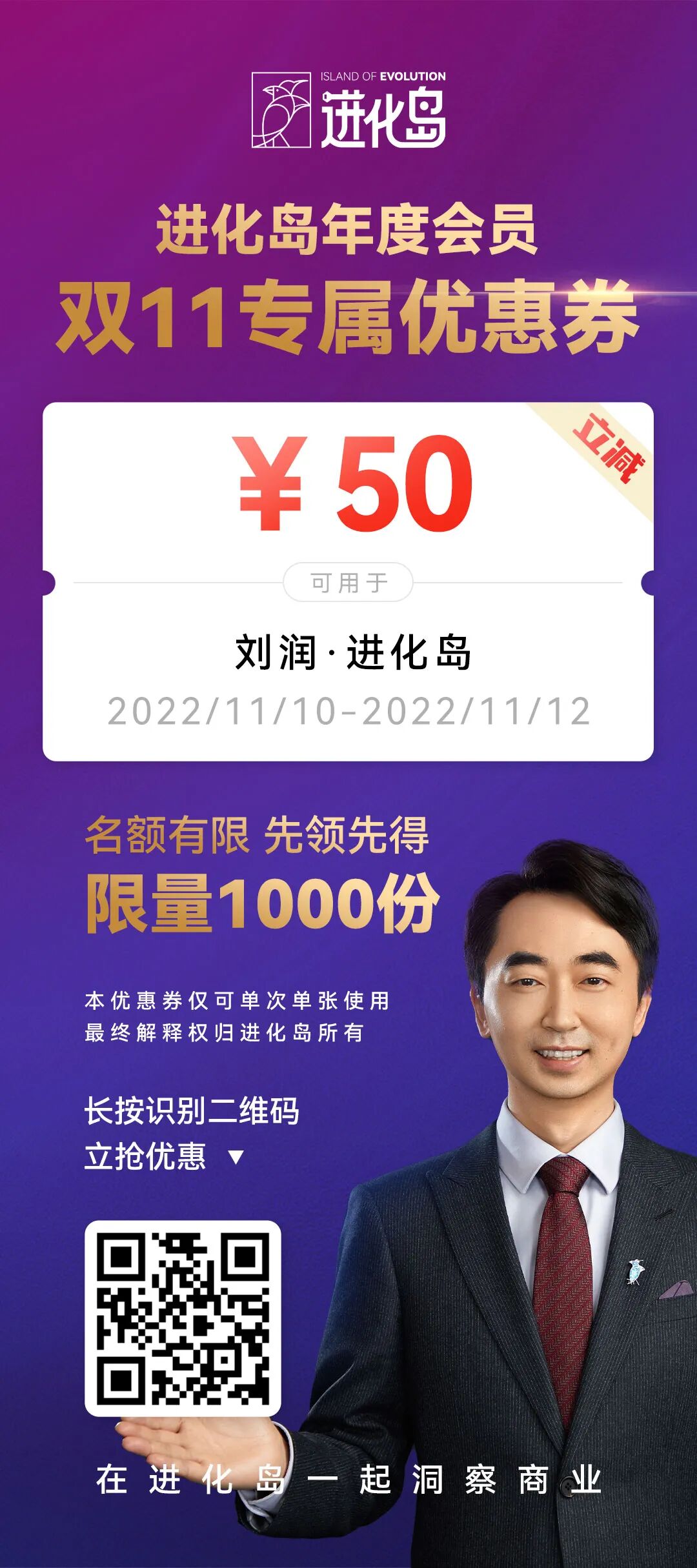 明天双十一,“刘润进化岛”社群一年一度最大力度限时优惠活动上架了,扫码下方图片二维码即可参与,数量有限,领完即止。错过这一次,再等一年。