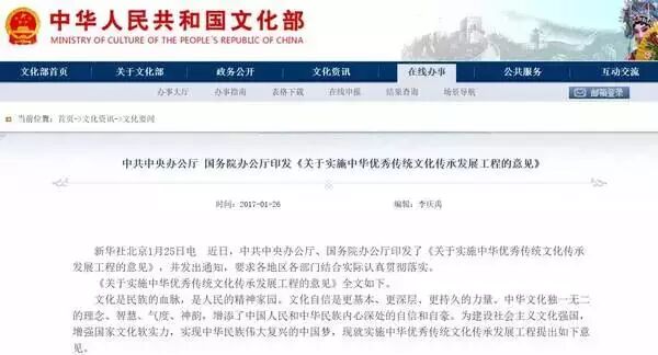 中共中央办公厅、国务院办公厅印发了《关于实施中华优秀传统文化传承发展工程的意见》,并发出通知,要求各地区各部门结合实际认真贯彻落实。