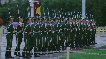 国旗护卫队护旗方阵在下了金水桥之后,36名国旗护卫队队员一起开始正步走,一百步正步走后到达指定位置变换为齐步走。