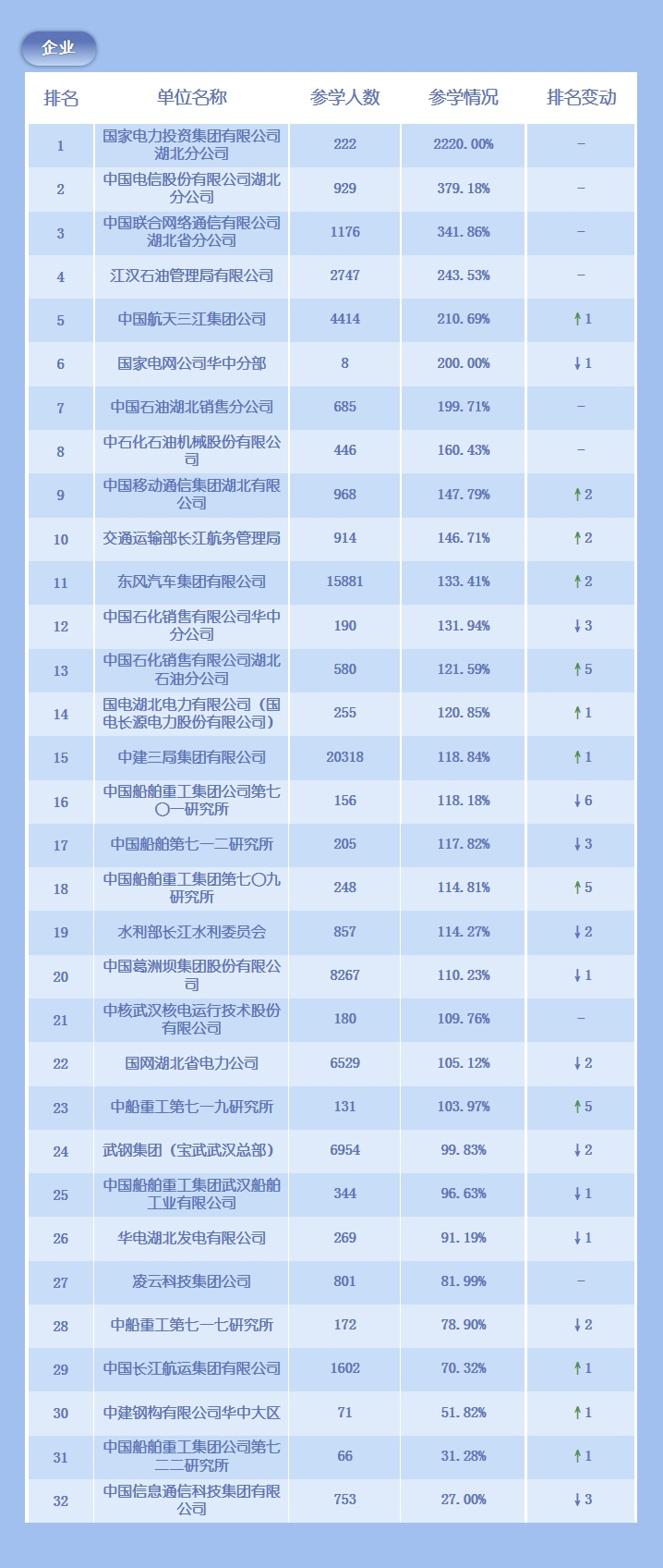 国家电力投资集团有限公司湖北分公司、中国电信股份有限公司湖北分公司、中国联合网络通信有限公司湖北省分公司、江汉石油管理局有限公司、中国航天三江集团公司等23个企业参学率达到100%。
