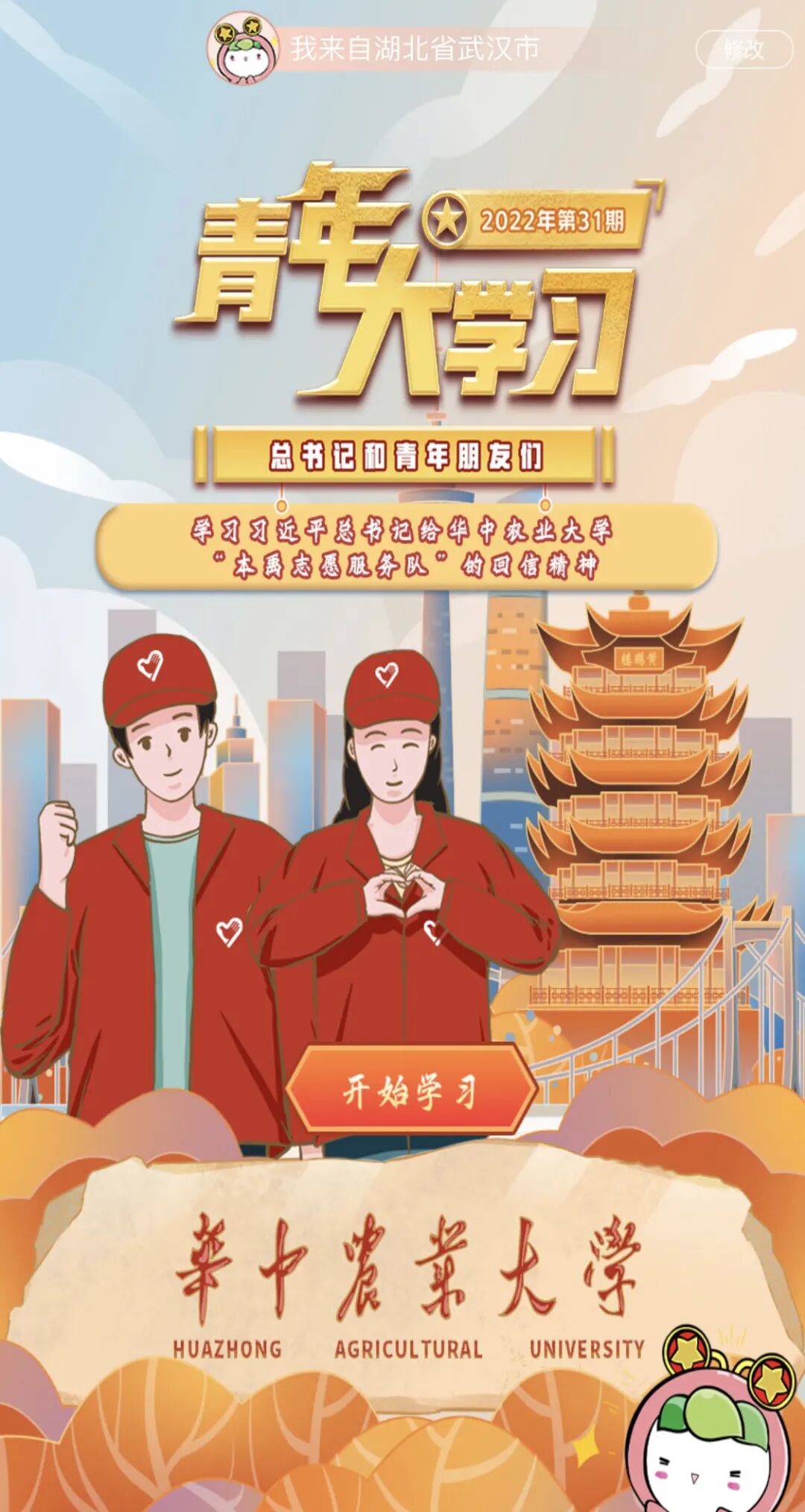 “青年大学习”网络主题团课走进华中农业大学,带领团员青年重温习近平总书记给华中农业大学“本禹志愿服务队”回信。