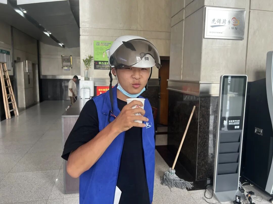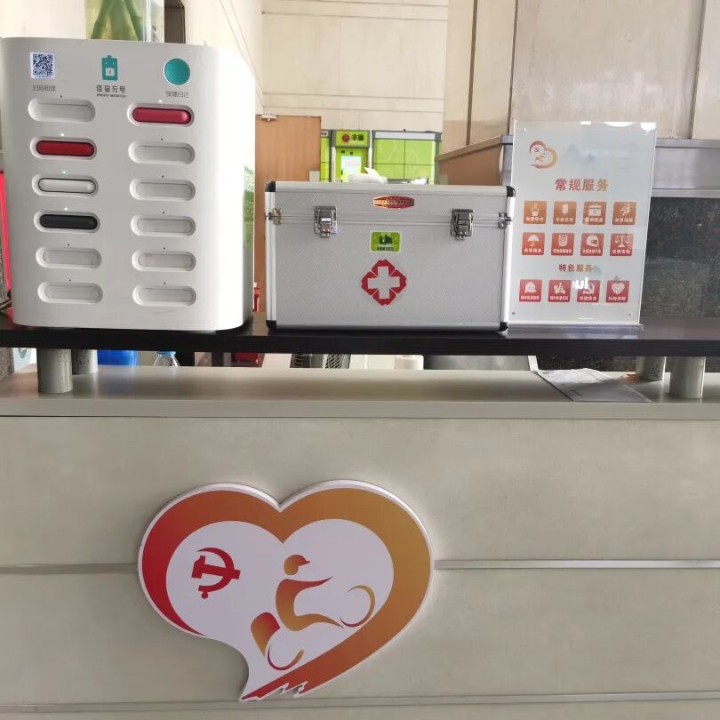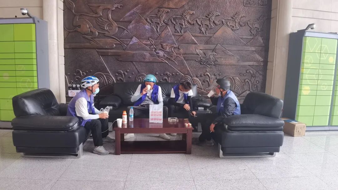 走进绿都世贸广场写字楼大厅,一处温馨的小沙发吸引了大家的目光,宽阔的休息环境、简约舒适的桌椅,还有共享雨伞、应急药箱等免费医疗设施。外卖小哥们正靠在沙发上休息,等待工作派单,站内还添置了由众安慈善基金会赞助的夏季爱心冰箱,社区志愿者每天会进行两次补给,以便及时满足骑手小哥们的饮水需求。
