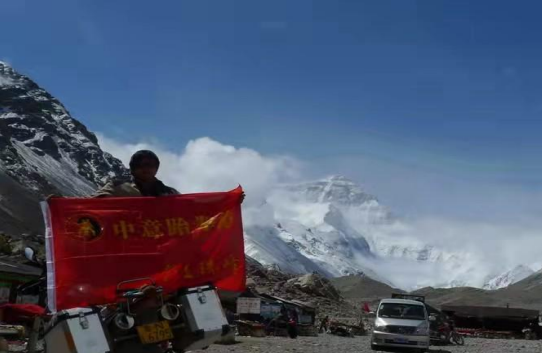 2011年,钟义骑着摩托从杭州出发驶向西藏,一人一骑,34天,12000多公里,登上海拔5200米的珠峰大本营,将一面武术旗帜插在雪峰沿上。四年后,他带着同样的旗帜去了塔克拉玛干沙漠,在这片号称“死亡之海”的地方,加了一抹武术红。