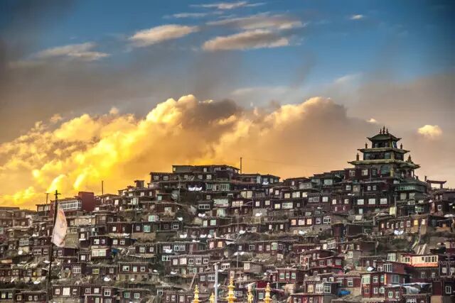 喇荣五明佛学院号称规模世界第一的佛学院,密布山坡的数万僧房展现了教众虔诚的信仰。成千上万连绵数公里的山谷布满了密密麻麻的小木棚屋,是喇嘛和觉姆(尼姑)的住处。【佛学院创始人--法王如意宝晋美彭措】