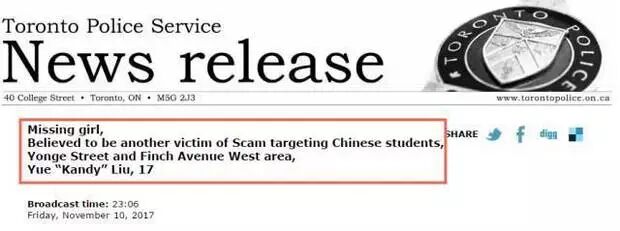 11月10日中午,发布了对于两名多伦多留学生失踪的调查通知,确认两人均为诈骗案件受害者。