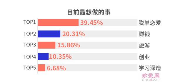 深入调查发现,现阶段,近四成90后单身人群最大愿望为“脱单恋爱”,其次为“赚钱”(20.31%)、“旅游”(15.86%)、“创业”(10.35%)和“学习深造”(6.68%)。可见“恋爱脱单”已成他们的首要任务。