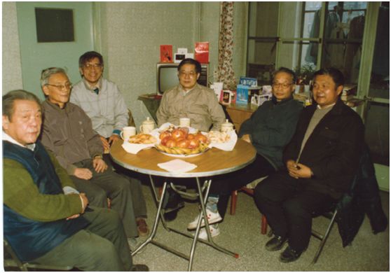 ▲1993年春节,理论物理所的学部委员们在彭桓武先生家中聚会,左起:彭桓武、戴元本、苏肇冰、周光召、何祚庥、郝柏林
