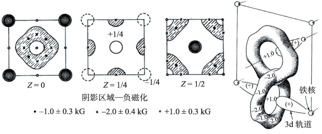 物质的磁结构对于理解低维系统、相变、阻挫等现象至关重要,非极化的中子衍射实验很难无差别地确定磁结构,而极化中子衍射是唯一能无差别分离磁散射和核散射的技术,可以精确地确定磁结构。在样品的分子结构,即化学结构因子 N 已知的情况下,极化中子测量可以直接提供磁性结构因子 M ,以及通过逆傅里叶变换得到的自旋密度。极化中子衍射适用于粉末和单晶样品,能够有效地区分布拉格衍射峰中核散射与磁散射各自的贡献[19],并辨别单晶内同时存在的不同磁性相[20]。这一应用自20世纪60年代由Shull等人首次完成了3d轨道铁磁体[21]的测量(图3)后,极化中子衍射就一直被用于测量自旋密度以增进对固态材料中电子分布的理解,至今仍然是极化中子的一种主要应用。目前,极化中子衍射测量自旋密度的应用已经拓展到了顺磁材料以及4f电子轨道的稀土化合物[22]。除此之外,极化中子对自旋密度的空间分布与温度相关的探测也使得实验可以测量自旋磁化率,对于探索非常规超导体中电子配对现象的本质[23]具有非常重要的意义。极化中子衍射测量磁性结构因子也同时被应用于磁性分子和有机磁铁的表征[24],这种分子磁性系统与离子系统相比,其磁性密度分布不局限在核子周围,因而对其分布信息的准确测量能揭示固体中紧邻分子轨道的磁性相互作用、化学键和电子分布的本质,为理论验证和预测提供实验佐证。