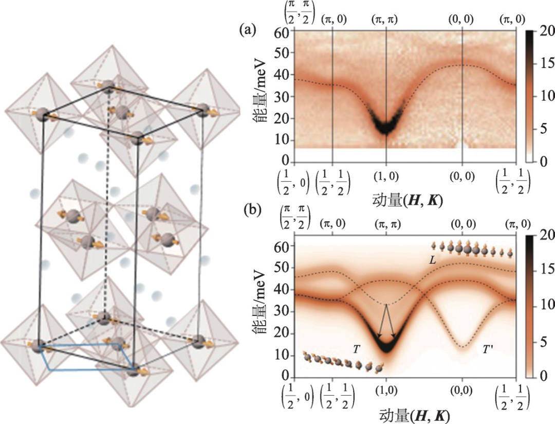 非弹性中子散射技术观测中子在散射过程中与材料的动量和能量转换,用于研究物质内部的动力学。1980年法国朗之万科学中心(Institut Laue-Langevin,ILL)开始在传统热中子及冷中子三轴衍射能谱仪基础上进行升级,实现了非弹性极化中子能谱(polarized neutron spectrometry)功能。由于物质内部的声子不改变中子的极化方向,而自旋波会改变,因此通过中子的极化分析可以很好地确定磁性材料中的各种不同自旋谱。ILL的谱仪IN12、IN20和IN14在研究材料声子、磁振子的动力学过程、自旋波的传播方面取得了巨大的成功。使用该技术所获得的成果包括对Haldane猜想的证实[29]、测量各向同性铁磁体内自旋扩散的能谱[30]、探明一维磁体中新的耦合模式[31]、研究非共线低维度铁磁与反铁磁系统中孤波的动力学性质[32]等,如图 5所展示的极化中子非弹性散射实验。在2000年后,极化中子非弹性散射更被成功地应用于高温超导体内自旋动力学的研究以及其他强关联电子系统中。