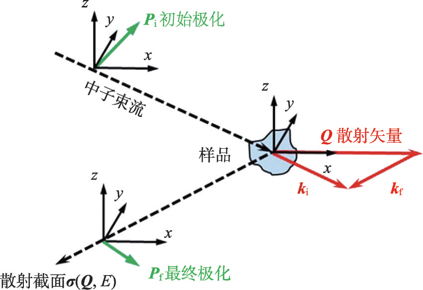 中子不带电,但带有磁矩和1/2自旋,其自旋在外磁场中存在两个极化本征态:与外磁场平行的“正向”自旋态和反平行的“反向”自旋态。当一束中子里处于两个本征态的中子数量不等时,即成为本文所主要讨论的极化中子(polarized neutron)。极化中子实验观测的数据包括中子束流的散射矢量、散射截面和中子的初始极化与最终极化矢量,这些矢量和它们所在的散射坐标系(x-y-z)下的几何关系如图1所示。