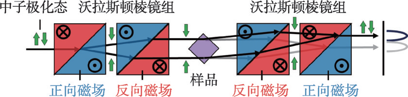 中子自旋回波(neutron spin echo,NSE)技术于1972年由Mezei提出[7],通过感知中子能量的变化所导致的解调退极化而获取极高的能量分辨率(neV)。中子自旋回波最重要的意义在于打破了中子散射实验中束流强度与分辨率之间的负相关,使得其相比于传统高分辨率手段(如中子背散射)可以在不大量牺牲束流强度的条件下获得极佳的测量分辨率。中子自旋回波技术在高聚物与其他复杂液体的研究中有广泛的应用,并且也能够被应用到玻璃体中的慢动态过程研究中[35]。以中子自旋回波技术为基础,其他类型的中子极化调制技术也在20世纪80年代出现。其中,1979年Mezei和Pynn指出,中子自旋回波技术可以被用于测量声子的能量展宽以及提升中子散射实验中的角度分辨率。这一理论逐渐发展成为中子共振自旋回波(neutron resonant spin echo,NRSE)技术,采用射频交变磁场对中子的自旋极化进行调制与解调,于1995年在德国由Golub等人实现[36]。NRSE 技术也可以被用于调制解调散射实验中的角度,这种新方法使用了磁性薄膜来定义中子自旋回波的场,使之可以被用于小角中子散射测量中,并将其可达到的尺度拓展到微米量级[37]。21世纪初,极化中子调制技术的一项最新技术发展是中子沃拉斯顿棱镜[38](neutron Wollaston prism,NWP),通过一对反向的三角形磁场对中子的两个不同自旋态进行双折射,从而对中子的动量进行调制和解调(图6)。这种测量方式对极化中子调制过程中的磁场强度与约束精度提出了更高的要求,因此产生了使用第二类超导体进行设计的超导极化中子调控设备[39]。