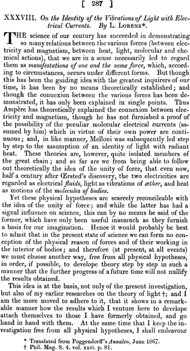 2. 对洛伦茨这些见解的某些表述综合了他1867年发表的另一篇文章,题为“论光”(On Light)。那篇文章是科普,直到2018年才被丹麦科学史学家黑尔格·克拉(Helge Kragh)译成英文。说到这篇科普,顺便提一下,其中有一句话在我看来达到了极高的科普水准。那是对可见光的频率之高所作的形容(目的是凸显以太假设的缺陷——因为如此高频的横波需要超高的应力):“光线在一秒钟之内传输到眼睛的振动数目需要几百万年才能数清。”