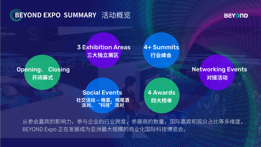 点击获取 BEYOND Awadrs 2022 完整获奖名单BEYOND Expo 2023期望站在全球各行业的科技前沿,全面展示和深入探讨科技的商业应用与社会价值,同期举办超多社交活动,国际资本对接会、创新路演,闭门会议等活动为全球科技创业者搭建一个以创新为核心的资本网络,同时为投资人及投资机构提供优质项目来源,精准对接;带领媒体巡展,企业获得更高多品牌曝光;此外我们还将举办晚宴、鸡尾酒派对、“科技”派对等多样活动,打破地域界限,在轻松、愉悦的氛围中高效社交,还有更多形式多样的官方赛事为全球参展企业及参会者带来更为丰富参会体验,促进行业交流,进一步提升参展企业的品牌影响力和品牌知名度,触达全球更多的科技爱好者。