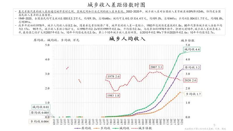 上面只是在探讨方法论,计算结果大家可以一起来讨论验证。如果没有很多交叉验证的话,也很难说一个发现是不是能够反映真实情况。基尼系数是包括了很多方面收入差异的。进一步展开分析,一个角度是城乡收入差异。具体说,城镇平均收入是4.4万,农村的平均收入是1.7万,城乡倍数大概在2007年达到了顶峰约3.1倍,后来有所回落,到现在城市收入约是农村的2.6倍。