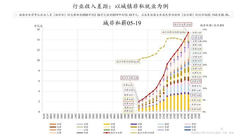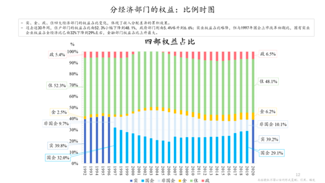 如果说上述那些收入是分配的起点,下图我们计算的权益就是分配的终点,是收入差异多年连续累计的结果。国家经济最重要的统计表格之一是资产负债表,并分成几大部门列示:包括住户部门、企业部门(金融、实业)、政府部门等。从权益角度来讲,以参与经济的实体活动单位为基准,计算到底积累多少钱,包括卖了多少东西、付出多少工资等,最后剩下多少利润,这些利润积累就变成权益。通过权益,我们能够很清楚地看到各部门累计分配占比情况:住户部门、包括工薪阶层,也包括部分小微企业能分配多少;而实业里面又分成了国企和非国企。