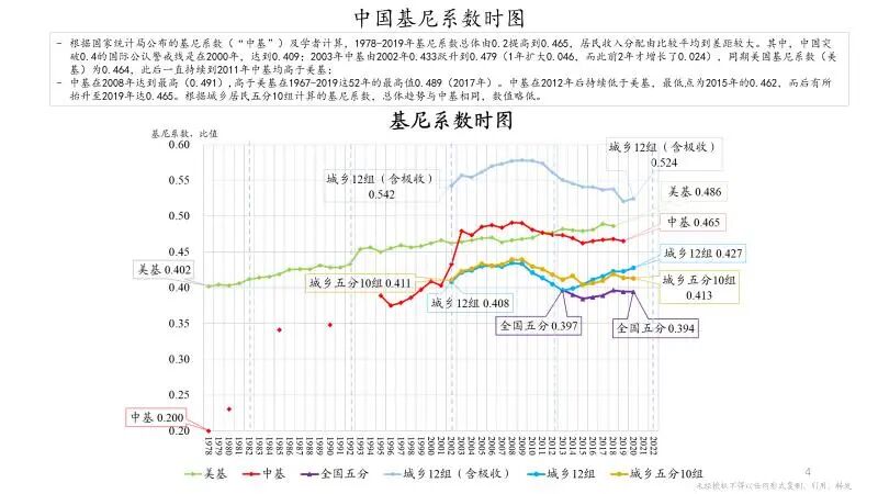 如果这个解释是对的,平常我们说的基尼系数0.4以上就值得关注。我能找到全国五等分的数据,以及城乡居民各自分成20%的五个等分,计算出各自的平均收入,这样的话我们就也能粗略估算出基尼系数。图中红色的线可以追溯到1978年,主要是统计局自己公布的全国居民人均可支配收入基尼系数。在1978年的时候0.2,到2003年上升超过0.45的水平,然后上下波动。与同期美国基尼系数比较,我们之前是低于美国,2003年以后超过它,后来又有所回落。