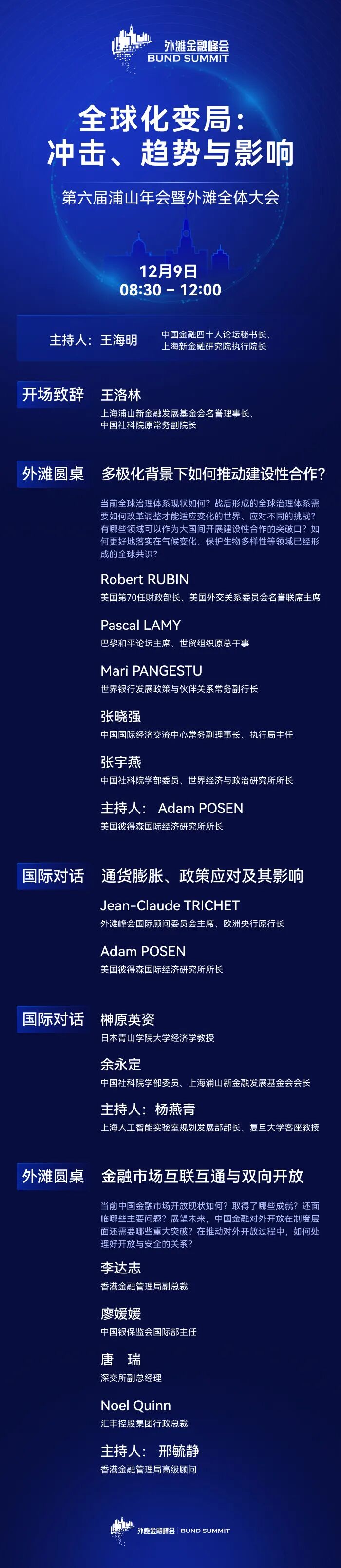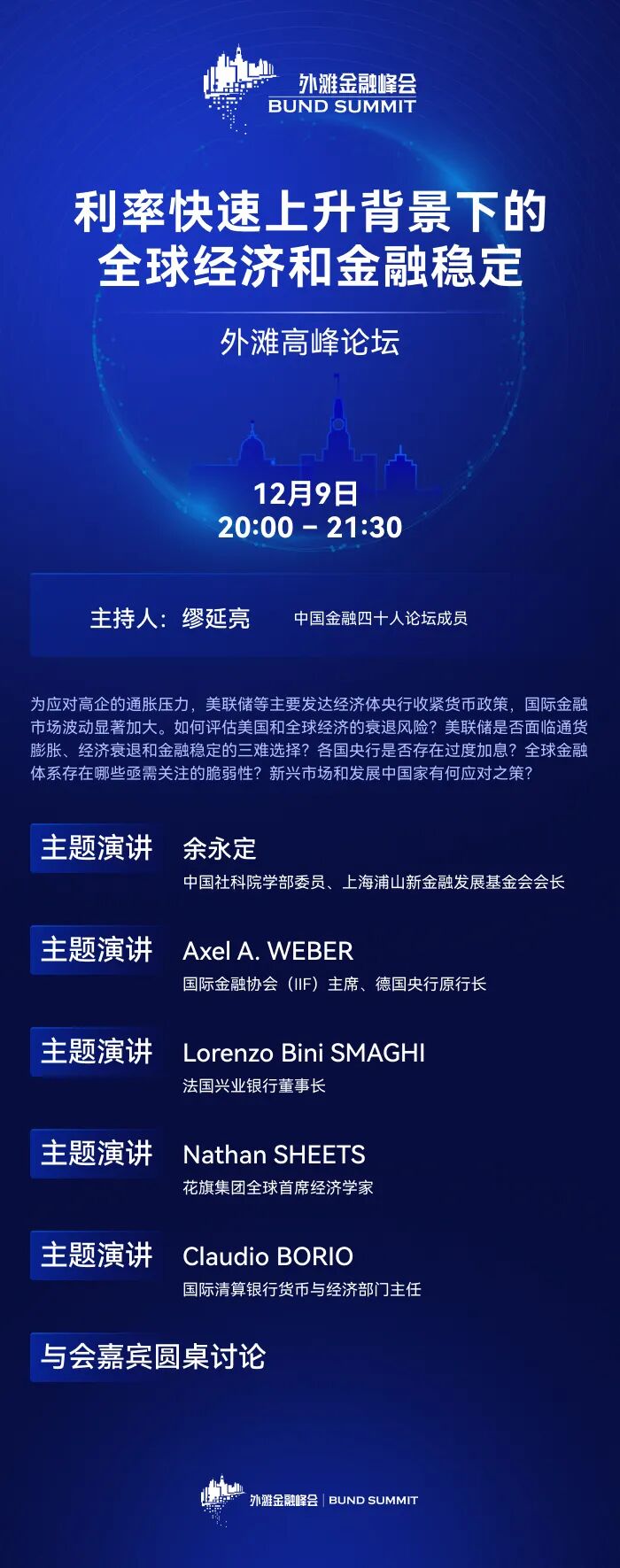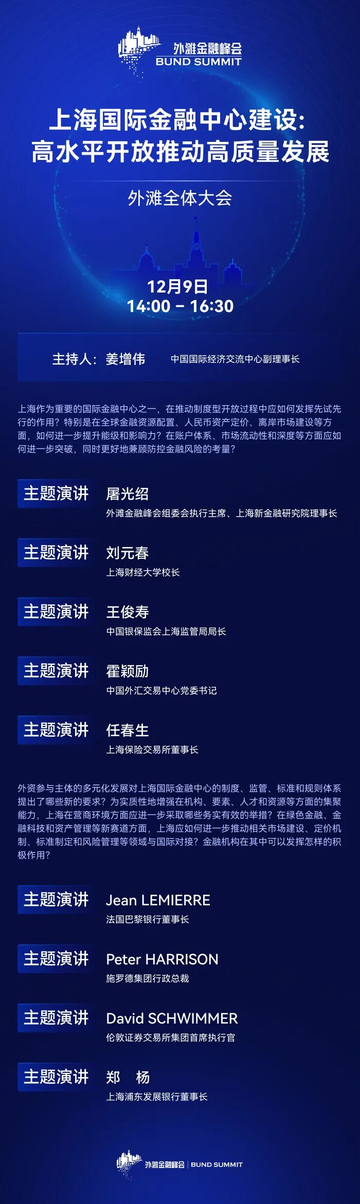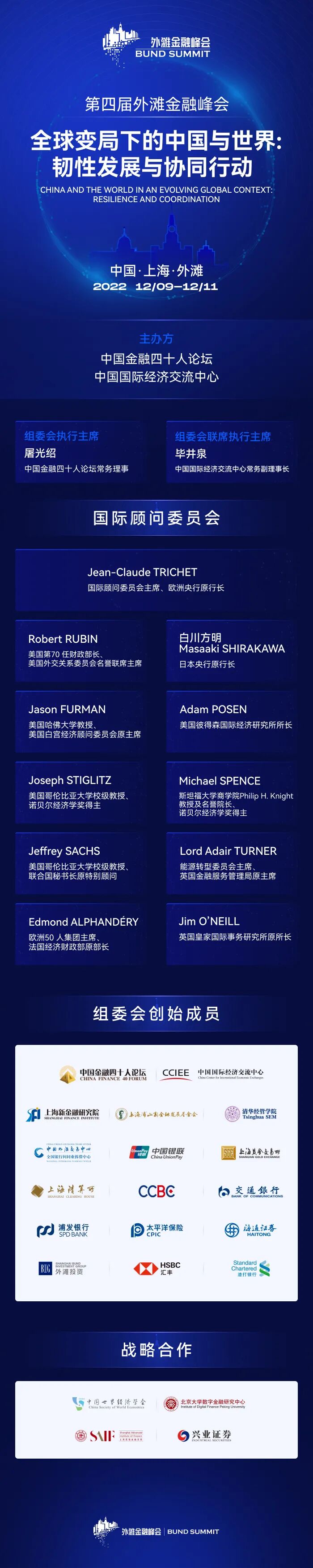 12月9-11日,第四届外滩金融峰会“全球变局下的中国与世界:韧性发展与协同行动”,将以线上线下相结合的方式在上海市黄浦区召开,并同步进行全球网络直播。第四届外滩金融峰会由中国金融四十人论坛(CF40)与中国国际经济交流中心(CCIEE)联合主办。峰会持续聚焦绿色金融、金融开放、资产管理、金融科技四大主题,坚持“国际化”、“专业化”定位,为上海建成具有全球重要影响力的国际金融中心,为中国作为建设性力量参与国际治理,为国际社会消弭分歧、增进互信、凝聚共识,贡献价值与力量。本届峰会共设立6场外滩全体大会、2场外滩高峰论坛、5场外滩闭门研讨会、3场外滩专题会、6场高端国际对话和10场外滩圆桌。
