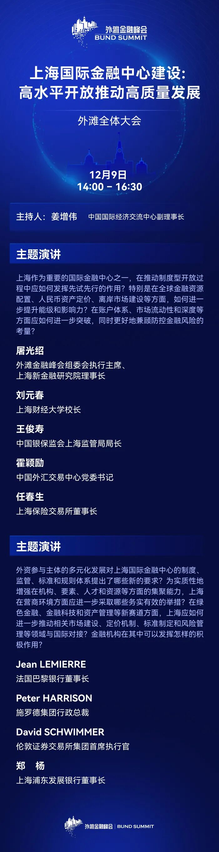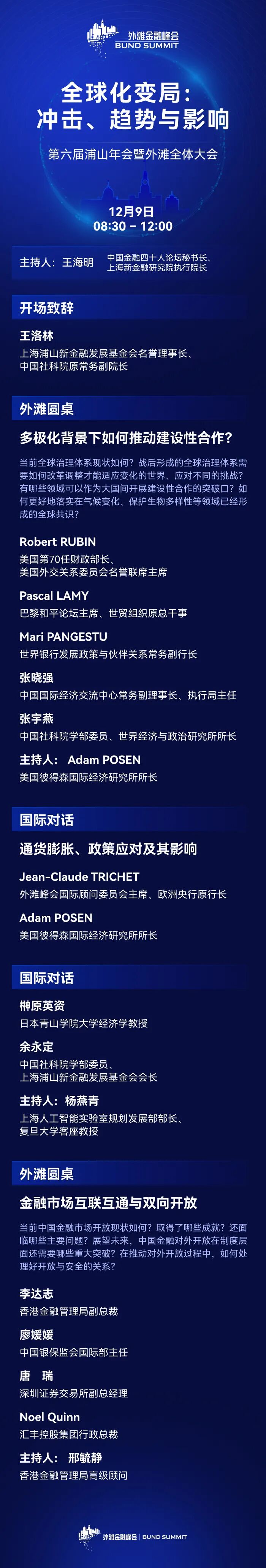 本届峰会为期三天。今日峰会共设置两场全体大会——第六届浦山年会暨外滩全体大会“全球化变局:冲击、趋势与影响”,以及外滩全体大会“上海国际金融中心建设: 高水平开放推动高质量发展”。除此之外,还设有一场外滩高峰论坛、两场外滩闭门会、两场高端国际对话,以及两场外滩圆桌。