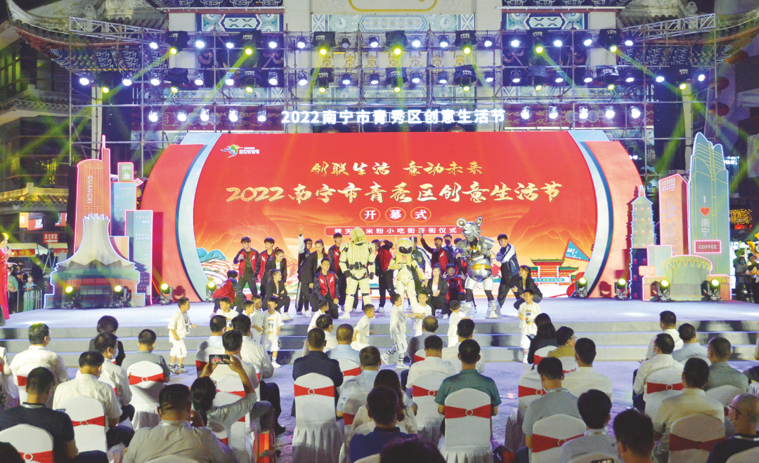 2022南宁市青秀区创意生活节由天下米粉邀请大会、青秀·绿野音乐节、广西创新设计周、商业文化创新计划、围棋嘉年华、新青年戏剧节、趣象儿童艺术周、城市微度假促消费活动8大项活动构成,活动将持续到12月。今年的生活节内容丰富、亮点纷呈,通过引入经济新业态、现代艺术、新潮产业设计文化等展览展示,与美食文化、音乐、体育等相互融合,加速文化创意产业发展,更好地满足群众对美好生活的新希望、新期待。