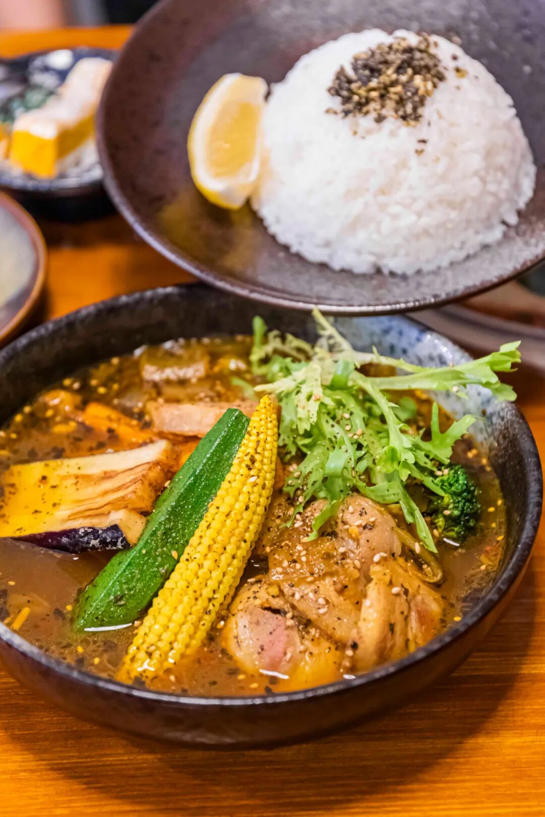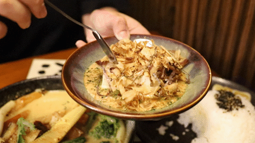 「汤咖喱」不同于传统咖喱,是以蔬菜+肉骨+海味熬制出的高汤做底,再将多种香料炒制成的秘制咖喱酱加入,同时搭配上多样的蔬菜,这就是清爽又美味的汤咖喱。而且每一碗都是单锅现煮,所以耗时较久。