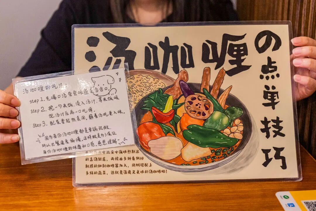 刚下单,老板娘就过来告诉好料菌,好料菌是全店zui后一个下单的,需要等待40分钟左右才行。在等待的过程中,好料菌浏览起了桌面上的小卡片,终于了解了什么是「汤咖喱」。