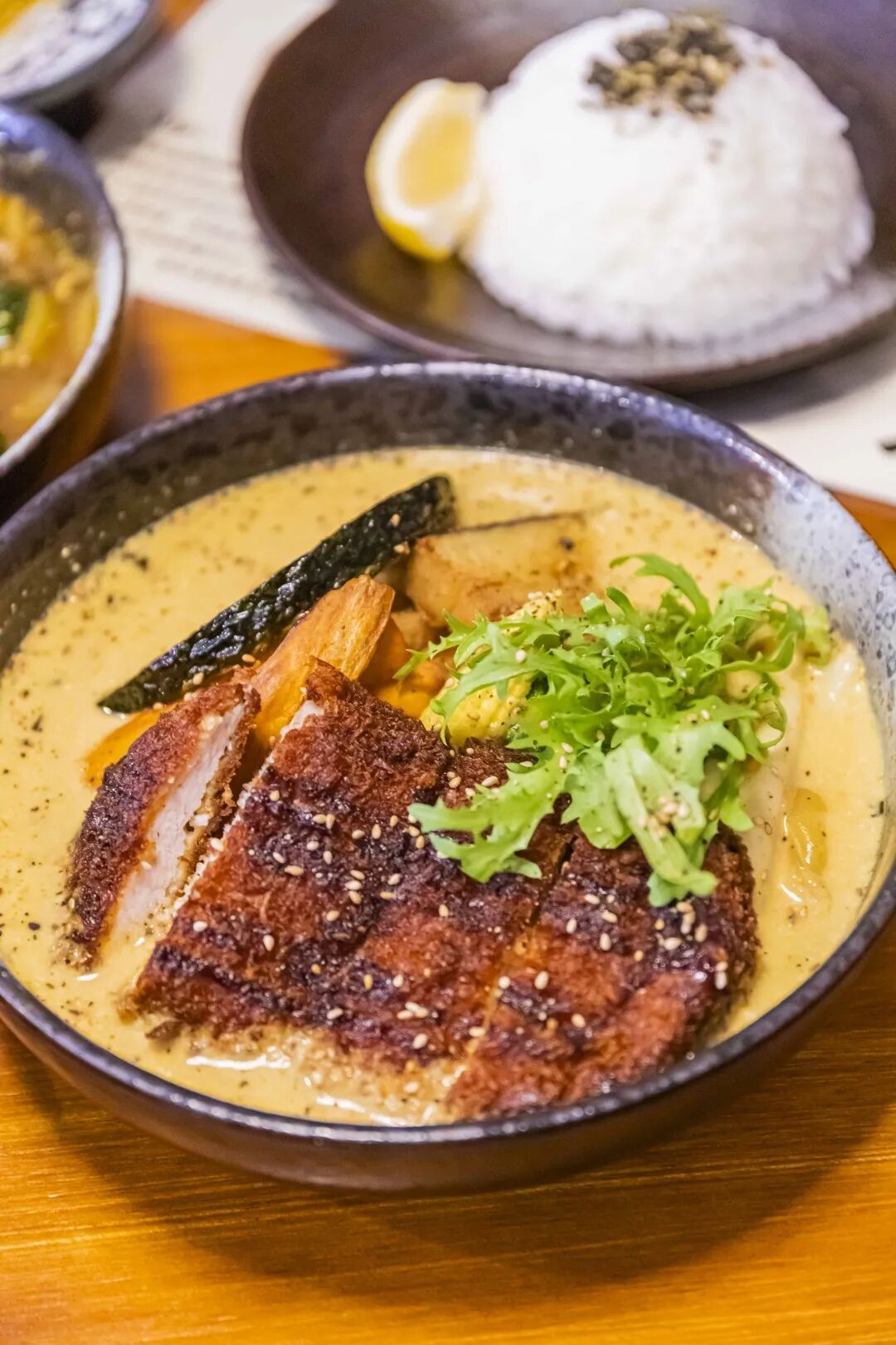 汤咖喱和饭是分离的,饭用精致的盘子装了一个“小山”,上面撒着一些海苔粉,旁边还配有一小半柠檬提鲜;还没喝汤,浓浓的南瓜味和椰子香味就扑鼻而来,猪排和配菜都被汤汁覆盖着,透露着一股“犹抱琵琶半遮面”的娇羞。